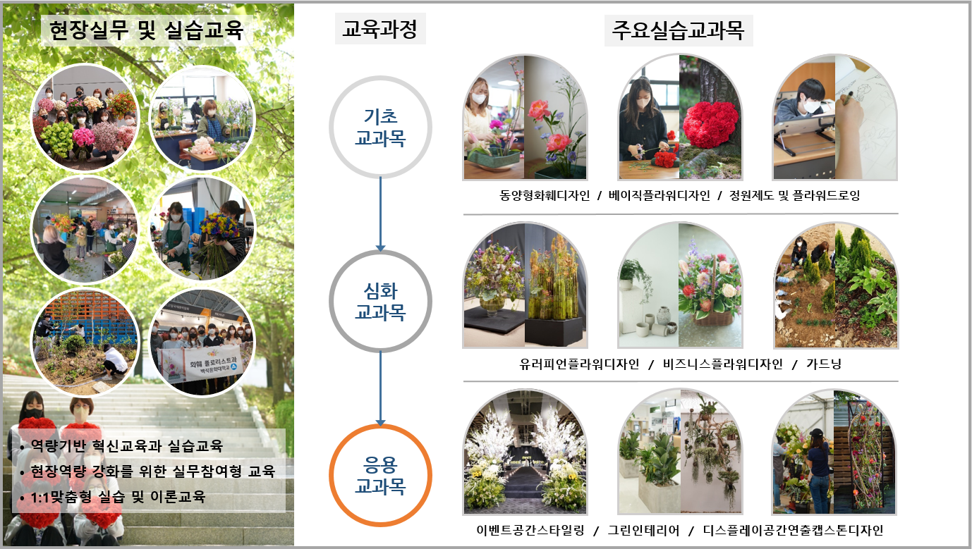 화훼장식과 가드닝의 체계적 이론과 혁신교과목을 바탕으로 학생별 1:1 맞춤형 실습교육 진행 및 화훼산업 현장에서 인정받을 수 있는 플로리스트 양성을 위한 역량기반 교육